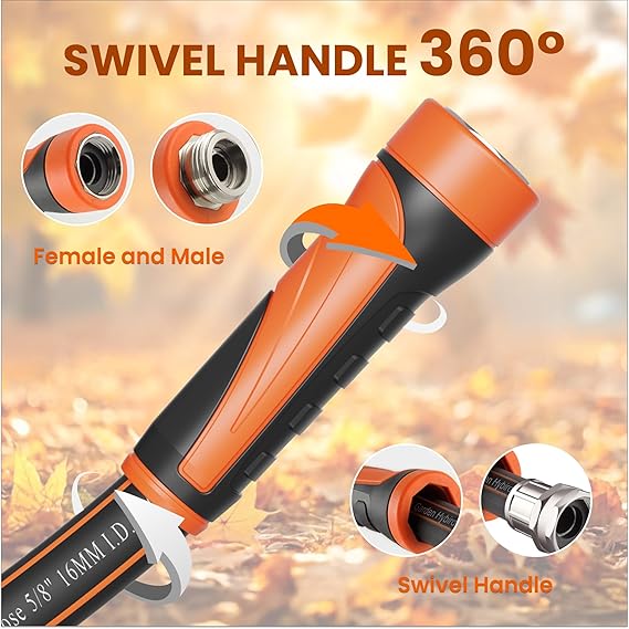 - Swivel Handle – The movable handle allows the hose to rotate freely to prevent twisting, the handle can also fix the fitting to make the connection with faucet/nozzle/sprinkler more easily and effortlessly.